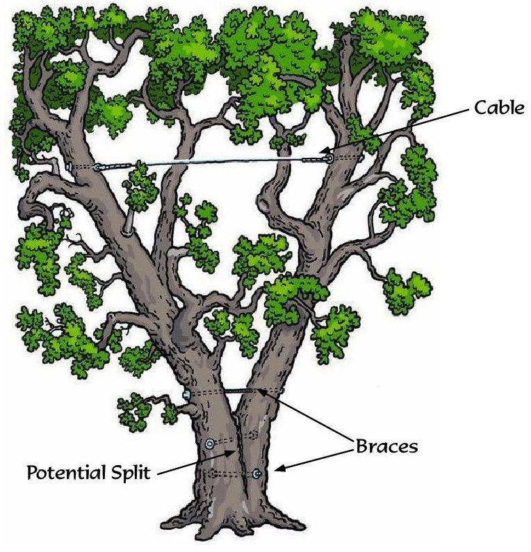 There are times when a structural defect in a tree can not be solved by pruning alone. Our professionals will identify those defects that can not be corrected and suggest an installation of a cable or brace may be warranted to reduce limb breaking and causing damage or injury. Cable and bracing are common forms of support for trees. Failure Prevention and Mitigation is done to reduce the chance of a limb or large portion of a healthy tree from causing damage from people or property. Cabling and Bracing also used for Preservation and Restoration.